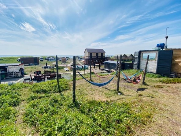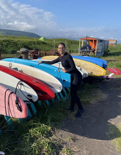I fell in love with surfing!!! We arrived at the beach planning to surf))) The black, volcanic sand is incredibly beautiful. Here we are already wandering around the camp, choosing our surfboards, getting wetsuits. The water is +10 C, the instructor is a legendary coach and surfer from the film about Kamchatka by Dud. There are about 12 of us beginners, wanting to learn to surf. We first practice with the board on the shore, now we have to repeat it in the water))) Swimming to the depth, you need to work hard with your arms. In the process of rowing, you catch a thrill and sway on the waves. We line up in the depth in a queue. The coach should push you on the board at the moment of a successful wave, and then according to the training scenario. First, you need to lie on the board and at the moment of the push, stand up with your torso on straight arms, catch the balance and fly at the speed of the wave to the shore. The first attempt, I succeeded. YAY, I scream with delight. I run to the shore, the waves are strong and it’s hard to get out of their depths with the board. I swim to the depth and repeat, everything works out. I start pestering the instructor to teach us to stand on our feet and glide on the waves. He long refused, saying we don’t teach that in the first lesson, but then he gave in and showed. Swim, attempt and YES, I’m flying. This short moment, a few seconds, but so much delight and adrenaline. The power of the ocean pushes you, you feel it – it’s such a force, filling the whole body with crazy energy. And repeat and again victory. And on this wonderful note, I put an end to my first surfing experience. Not everyone managed to repeat the lesson. The guys tried, one girl was covered with a board, she got scared and could not overcome her fear. Alexander did great, we both cheerfully rowed and glided on the waves, and then for a long time exchanged excitement from the emotions received. The process is energy-consuming, upon returning to the camp we were awaited by a heated bathhouse and a delicious dinner. It seemed incredibly tasty.